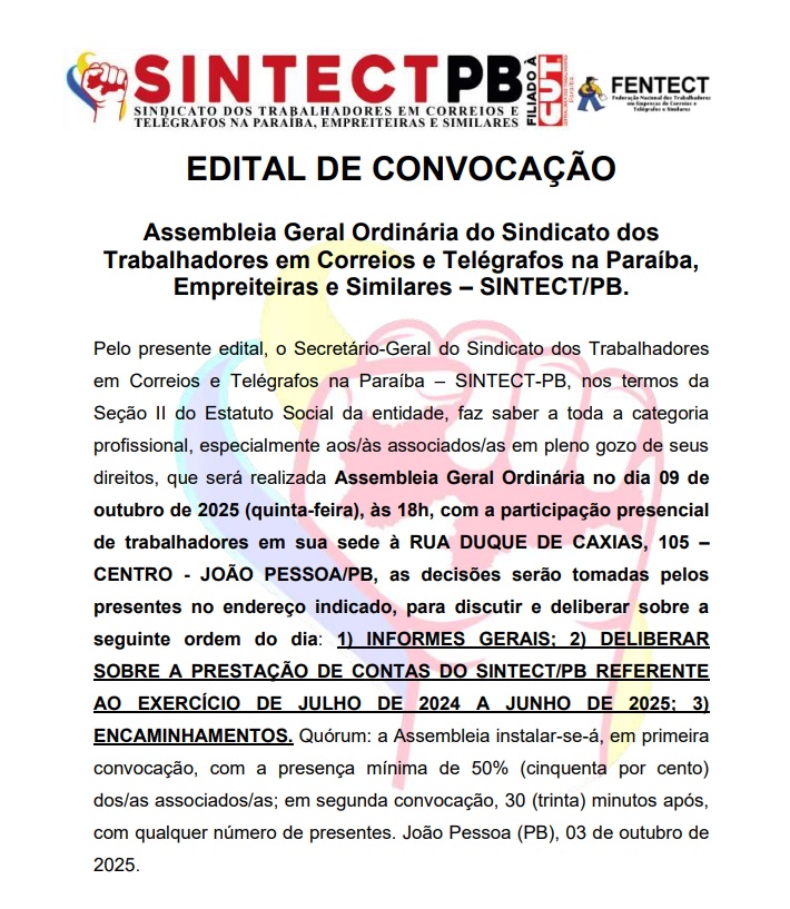 ASSEMBLEIA GERAL – 23 DE ABRIL | SINTECT-PB